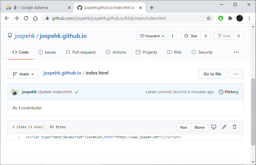 방법은 GitHub에 만들어 놓은 index.html 파일 안에 간단한 소스를 추가하면 되는데요, 아래 두 가지 중 하나만 사용하면 됩니다.
