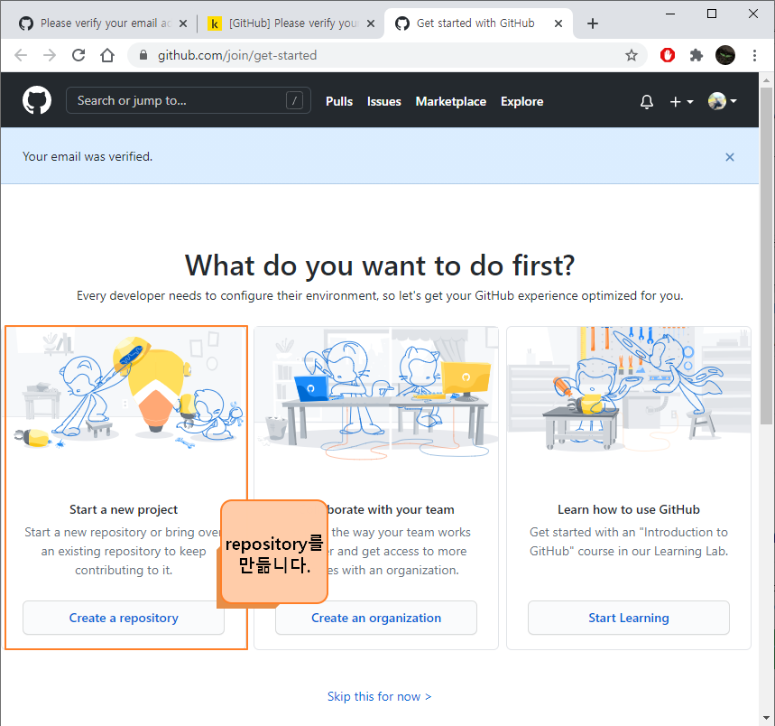 이 화면에서 첫 번째, Create a repository 를 누릅니다.