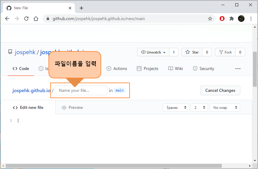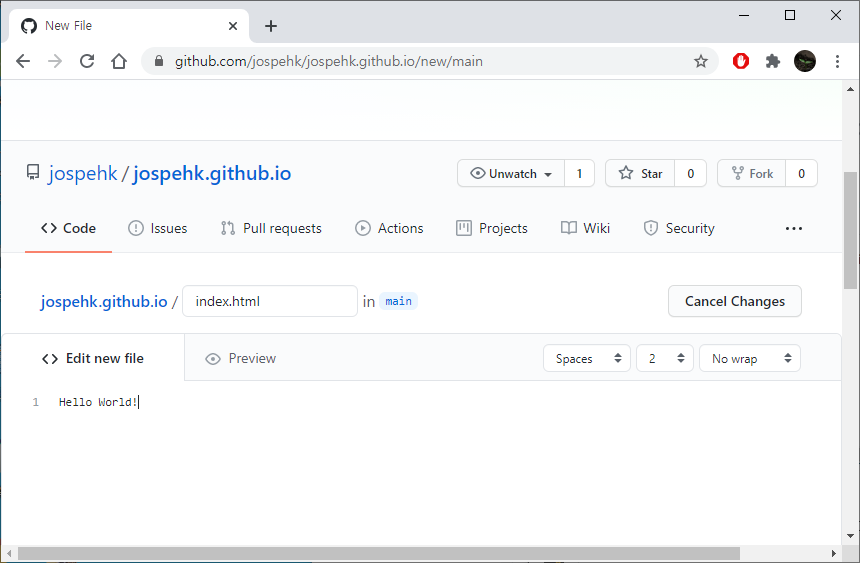 Name your file... 이라는 부분에 index.html 을 입력하고, <>Edit new file 이라는 부분 아래에는 Hello World! 를 입력합니다.