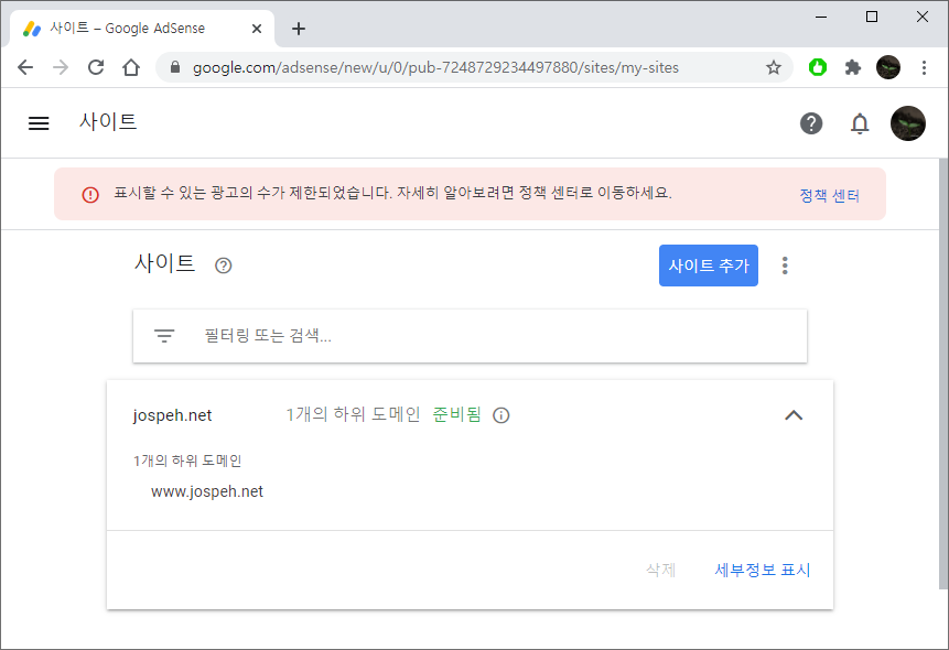 - 구글 애드센스에서 blog.jospeh.net을 jospeh.net의 하위 도메인으로 등록 - 인증 연동 성공