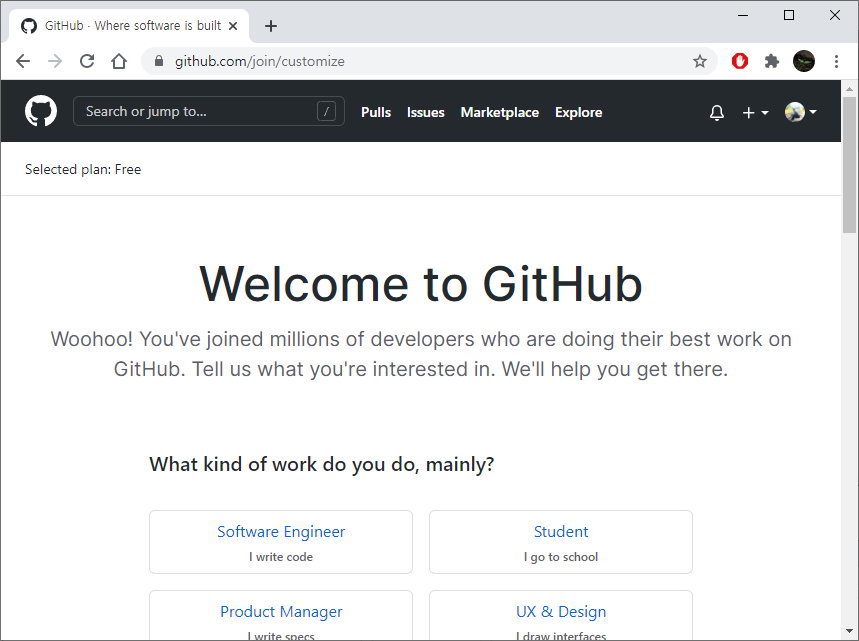 가입이 완료된 듯 환영문구가 나옵니다. 그리고 아래 몇 가지 질문사항이 있는데 GitHub를 어떻게 사용할 건지에 대한 질문인 듯합니다. 이 부분은 선택하지 않아도 된다고 하니 넘어가겠습니다.