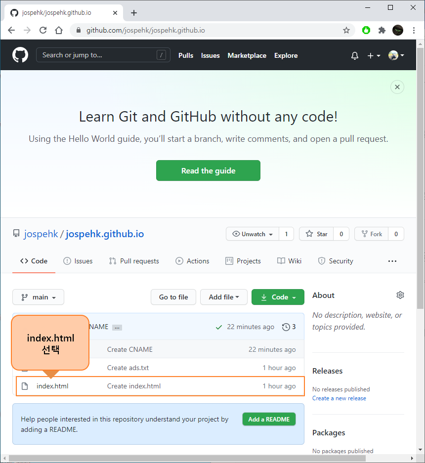 GitHub 의 Repository 에서 index.html 파일을 누릅니다.