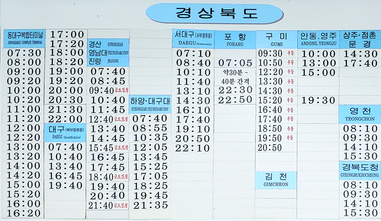 동대구복합터미널 / 대구(북부정류장) / 경산 / 영남대 / 진량 / 하양 / 대구대 / 대구(서부정류장) / 포항 / 구미 / 안동 / 영주 / 상주 / 점촌 / 문경 / 영천 / 경북도청