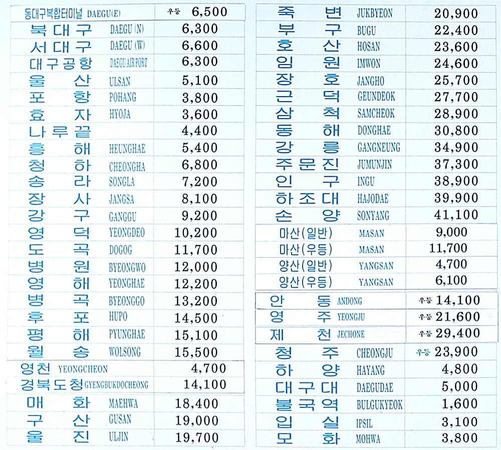북대구, 서대구, 대구공항, 울산, 포항, 효자, 나루끝, 흥해, 청하, 송라, 장사, 강구, 영덕, 도곡, 병원, 영해, 병곡, 후포, 평해, 월송, 영천, 경북도청, 매화, 구산, 울진, 죽변, 부구, 호산, 임원, 장호, 근덕, 삼척, 동해, 강릉, 주문진, 인구, 하조대, 손양, 마산, 양산, 안동, 영주, 제천, 청주, 하양, 대구대, 불국역, 입실, 모화