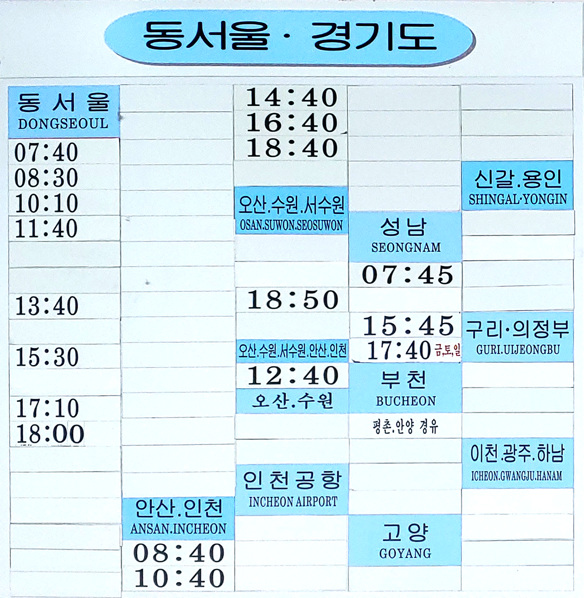 ( 동서울 / 안산 / 인천 / 오산 / 서원 / 서수원 / 성남 / 부천 / 이천 / 광주 / 하남 )