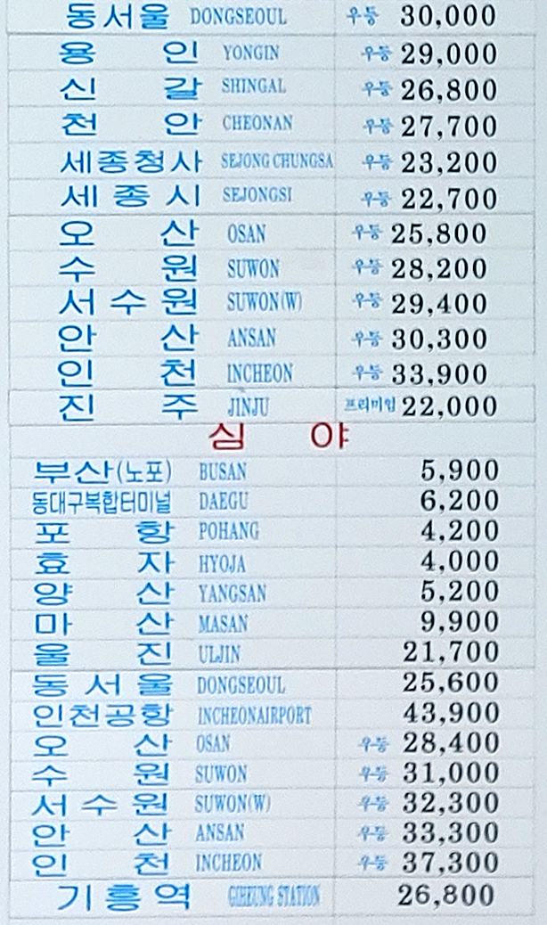 용인, 신갈, 천안, 세종청사, 세종시, 오산, 수원, 서수원, 안산, 인천, 진주, 기흥역(심야)