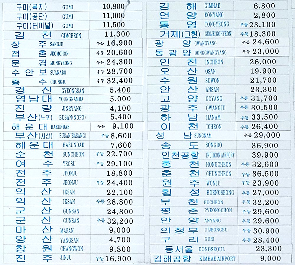 구미, 김천, 상주, 점촌, 문경, 수안보, 충주, 경산, 영남대, 진량, 부산노포, 부산사상, 해운대, 순천, 여수, 전주, 익산, 군산, 마산, 양산, 창원, 진주, 김해, 언양, 통영, 거제고현, 광양, 동광양, 인천, 오산, 수원, 안산, 고양, 광주, 하남, 이천, 성남, 송도, 인천공한, 홍천, 춘천, 원주, 회성, 부천, 평촌, 안양, 의정부, 구리, 동서울, 김해공항