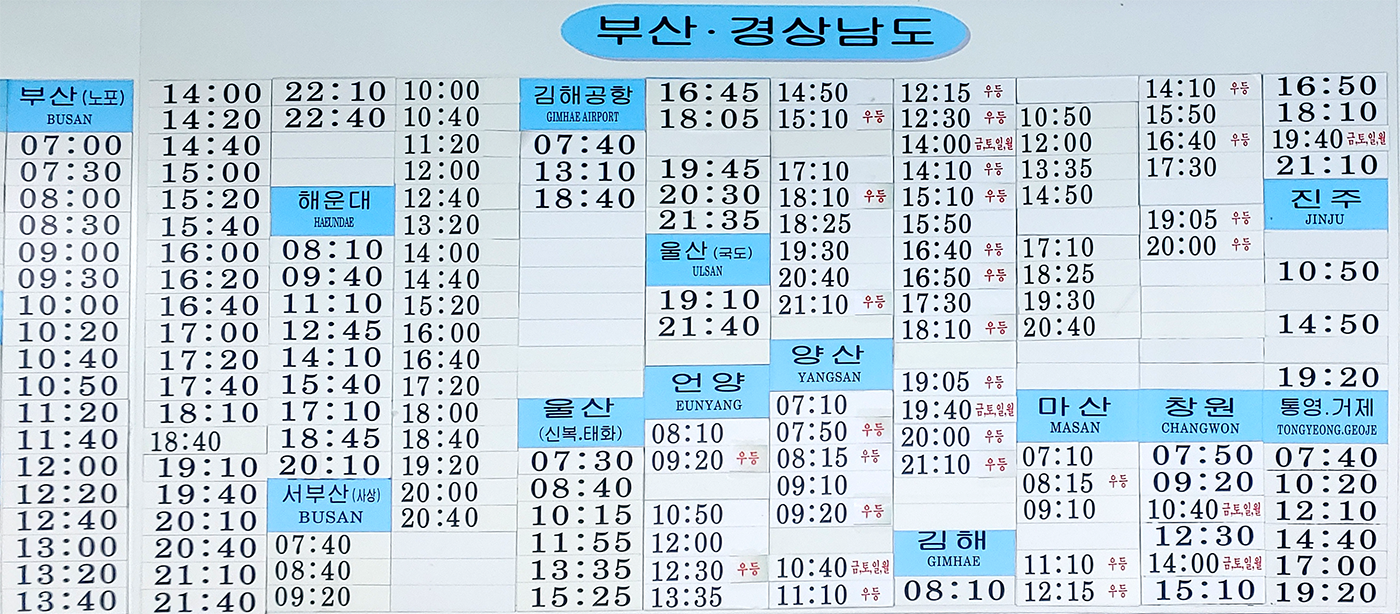 부산(노포) / 해운대 / 부산(사상) / 김해공항 / 울산(신복.태화) / 울산(국도) / 언양 / 양산 / 김해 / 마산 / 창원 / 진주 / 통영 / 거제