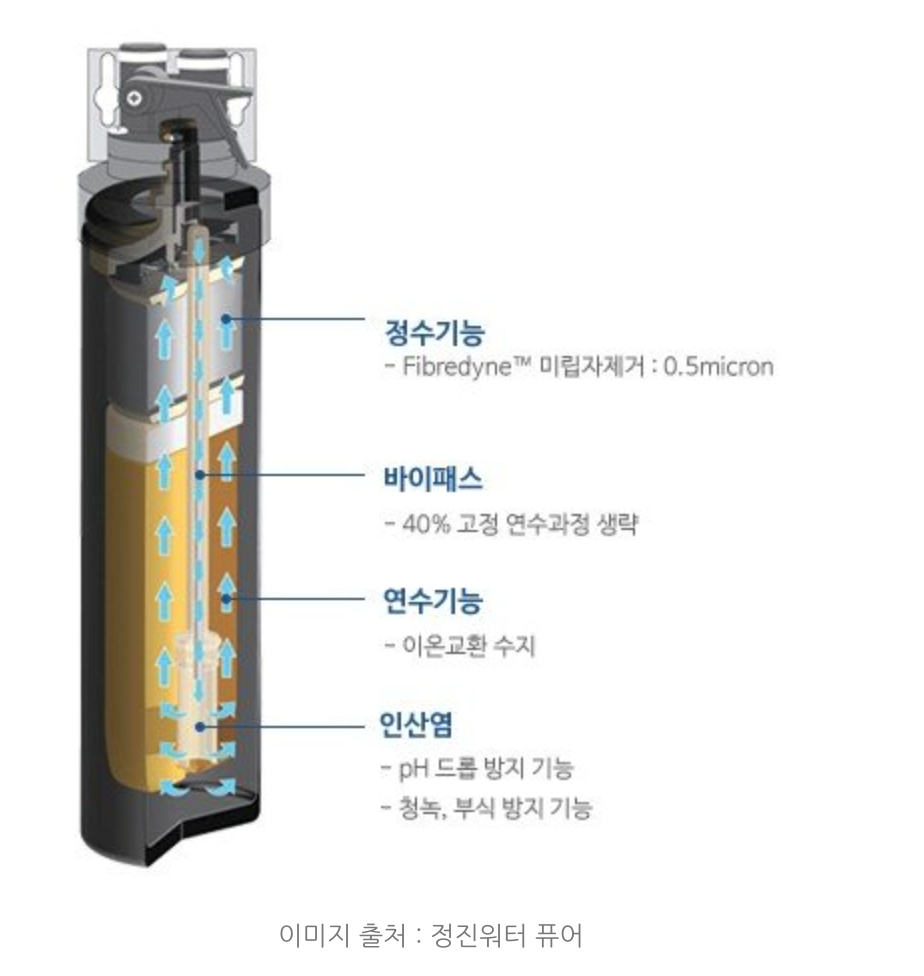 | 이온교환수지 | 물 안의 칼슘과 마그네슘 성분을 흡착 및 제거하여 나트륨으로 교환시켜 준다. 즉, 경수를 연수로 바꿔주는 기능을 한다. 정수필터라기 보다 연수필터라고 하는 것이 정확하다. 흡착량이 많아지면 소금물에 담가 재생해서 사용할 수 있다. |