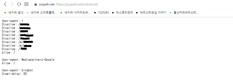 이렇게 만들었으며 robots.txt 파일을 확인하기 위해 주소창의 블로그 주소 뒤에 /robots.txt 라고 입력하였습니다.