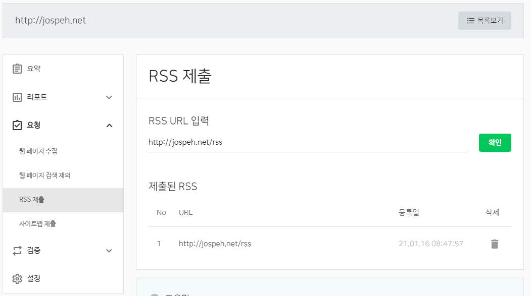 그 다음으로 RSS제출 합니다. 보통 사이트 주소 뒤에 /rss 만 추가하면 됩니다.