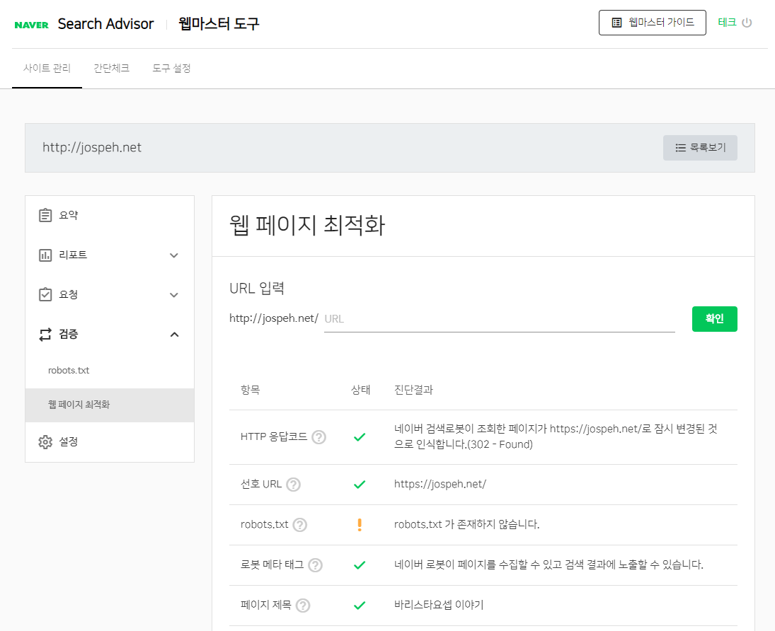 사이트주소 입력할 때 저는 아무 생각없이 그냥 jospeh.net 만 입력하였던 것입니다. 그러면 네이버 웹마스터도구에서는 기본적으로 http:// 로 지정해 버립니다. 티스토리 블로그는 https:// 로 지정을 해야 하는데 잘 못 지정 된 것이죠.
