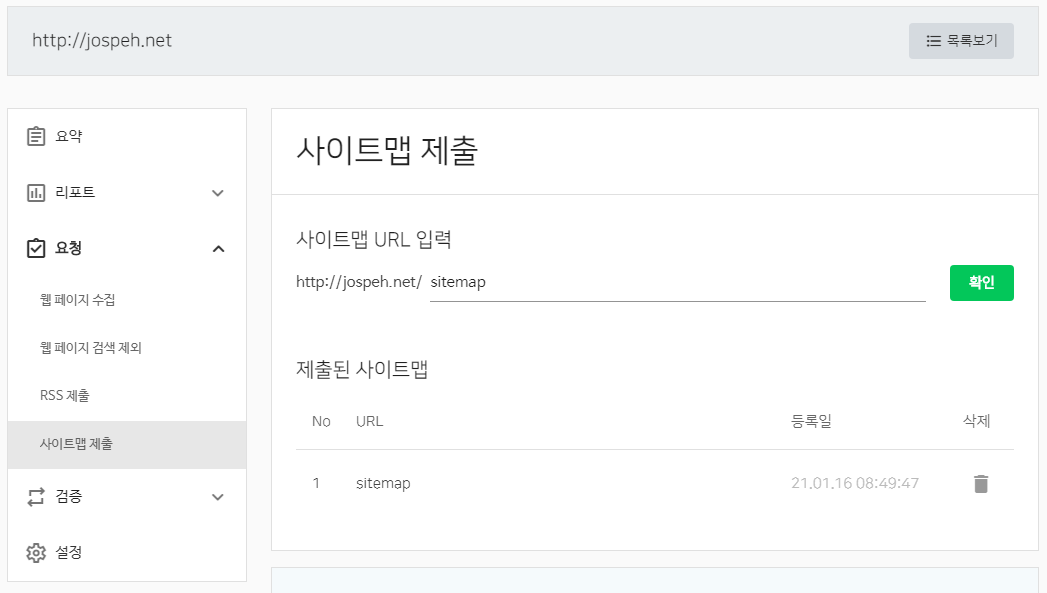 소유확인이 되면 아래와 같이 사이트 등록이 됩니다.