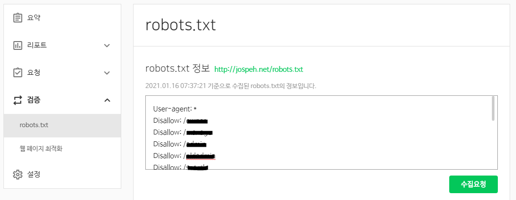 8. 검증 - robots.txt 클릭 - [수집요청] 클릭