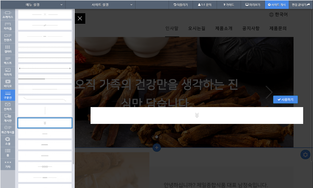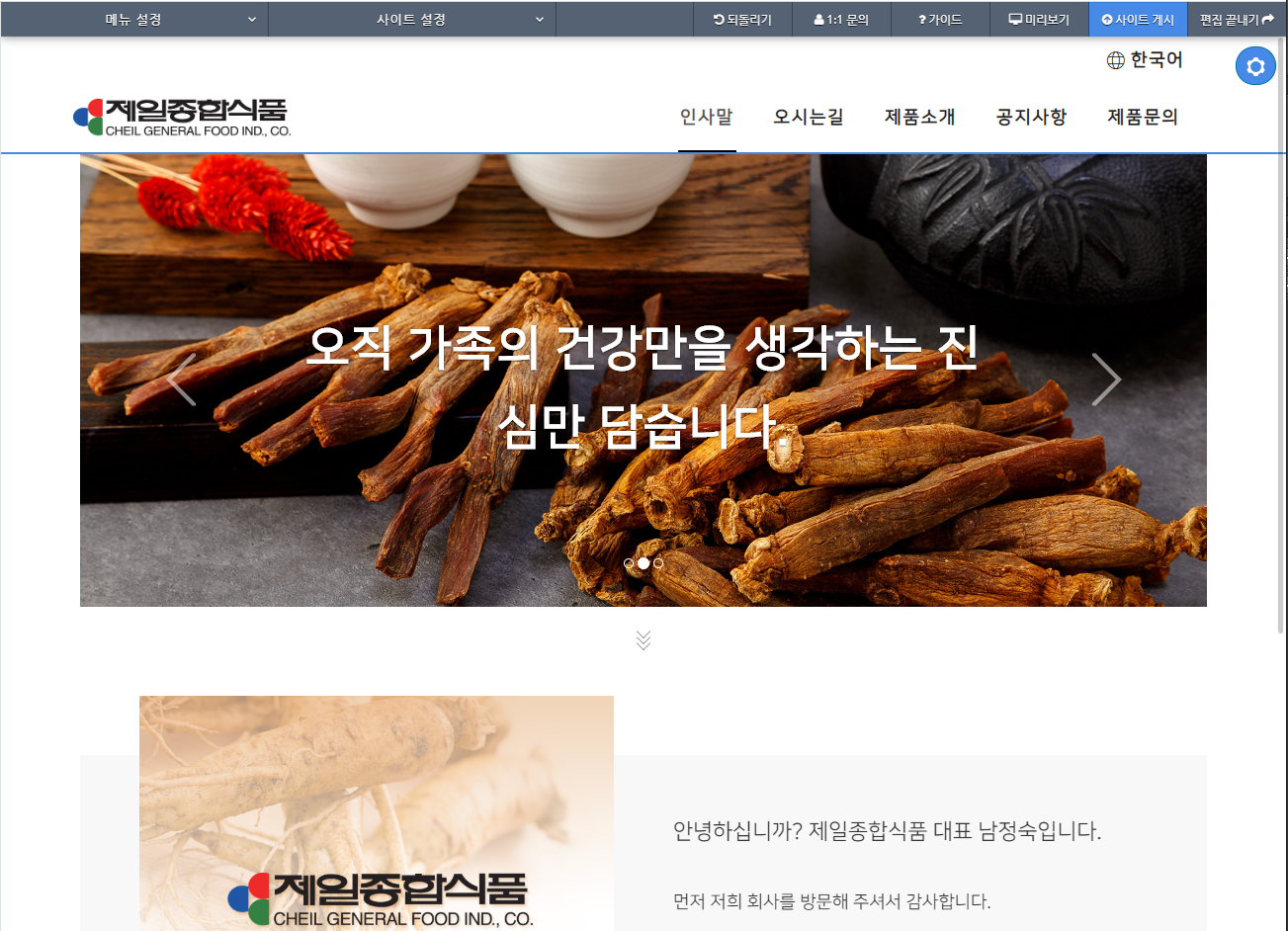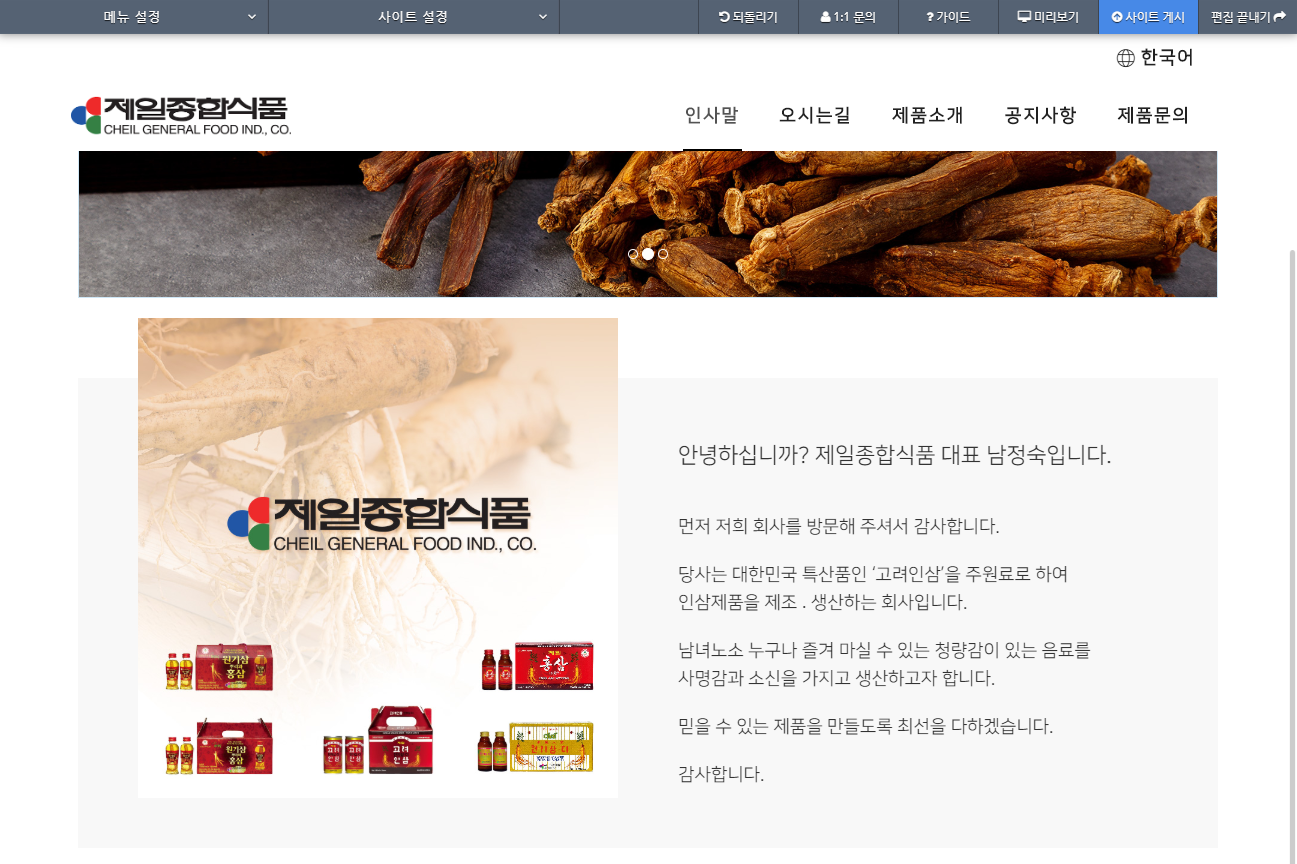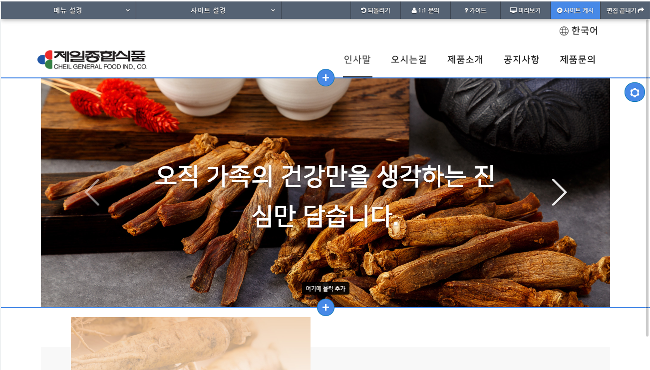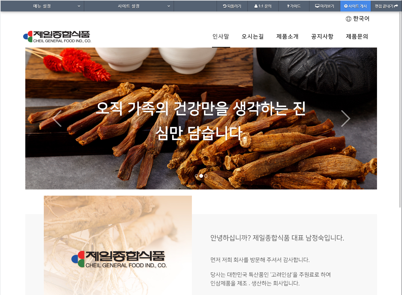- 업체 제품과 관련된 이미지인 인삼과 업체 생산제품을 적절히 조합한 타이틀 이미지를 추가합니다.