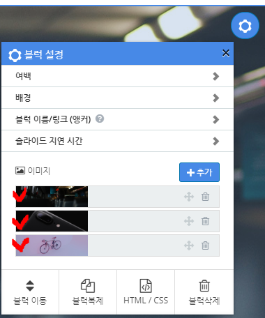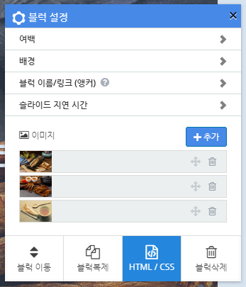 슬라이드 블럭을 클릭한 후 아래 블럭추가를 누릅니다.