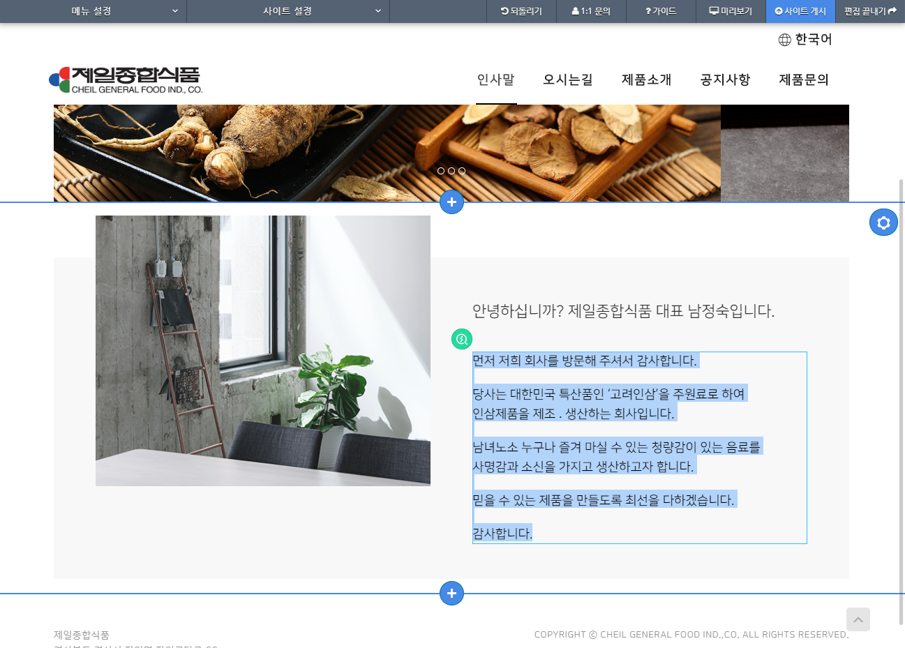 블럭 지정한 영역 보이죠? 저 부분에는 대표자님의 첫인사말을 넣은 후 아래칸에는 나머지 인사말을 넣어 보겠습니다.