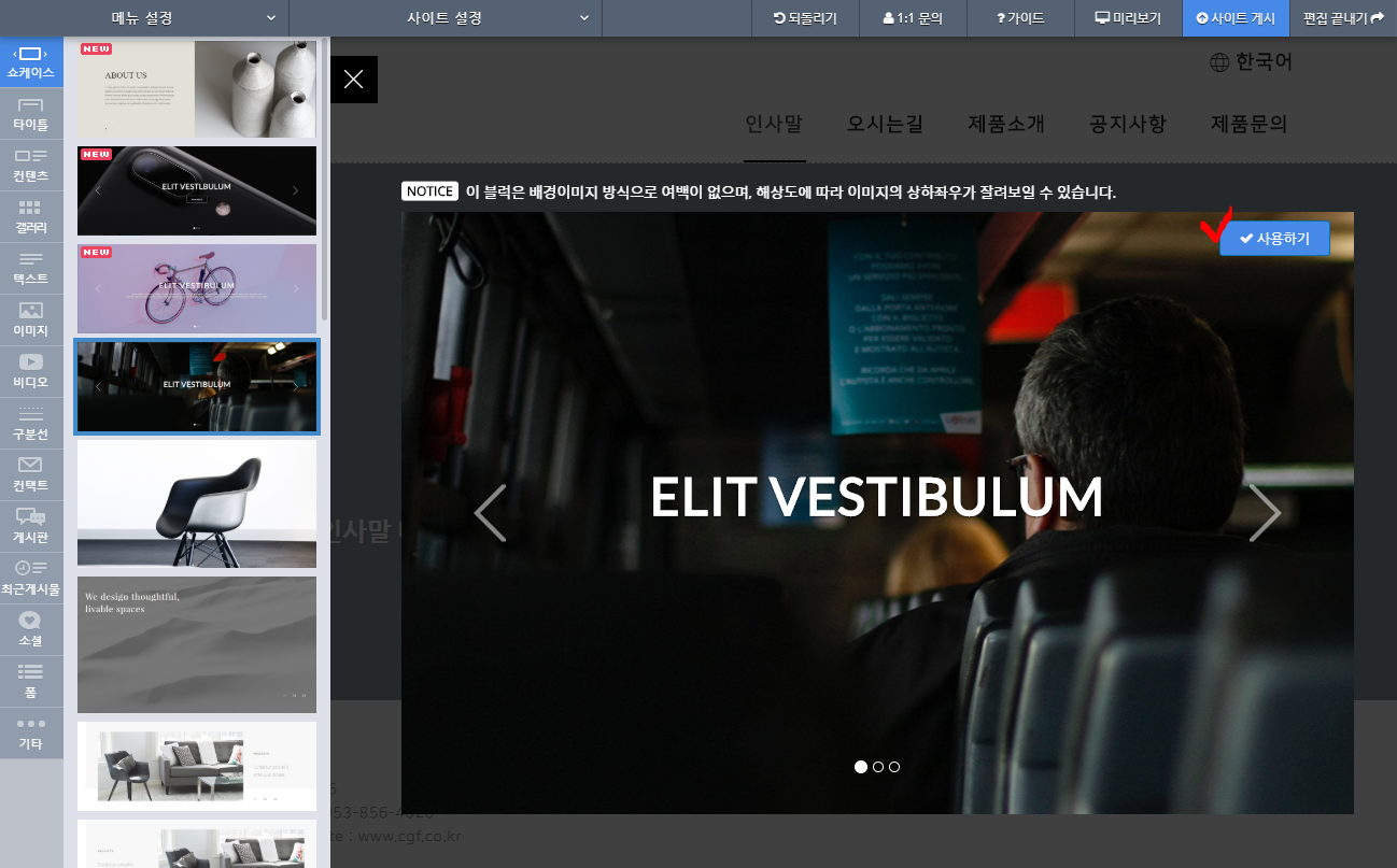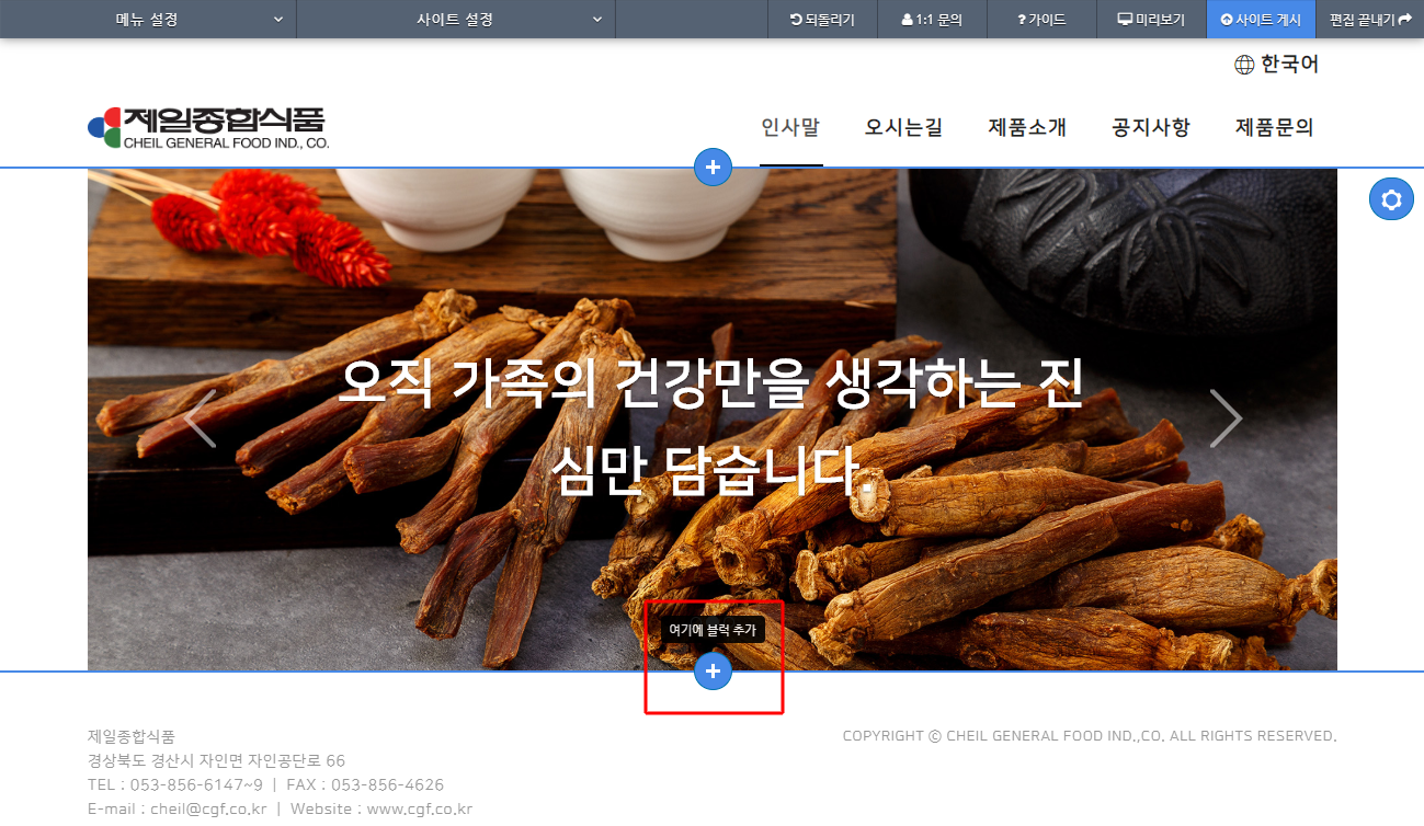 즉, 인사말 페이지를 편집/수정하기 위해서 단지 '인사말' 메뉴를 클릭하세요. 그다음은 원하는 구성요소(블럭)를 추가하세요.