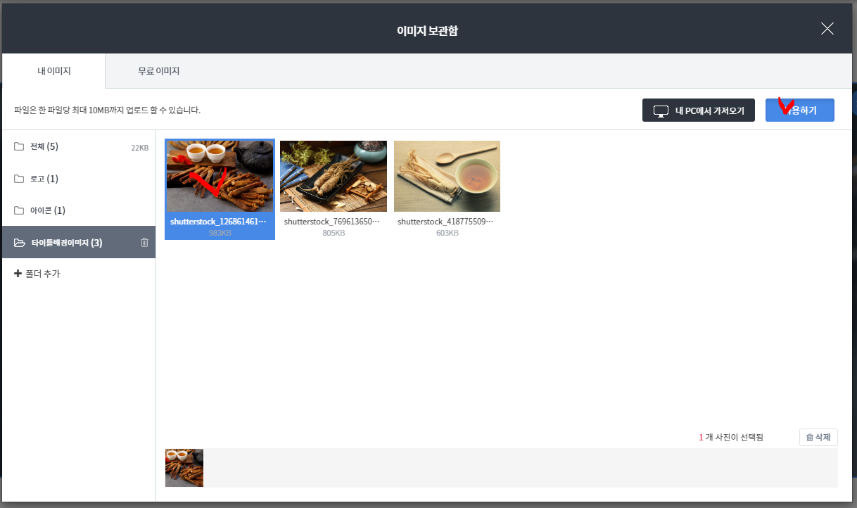 이미지 보관함에 3개의 이미지를 업로드하였으며 원하는 이미지를 선택 후 [사용하기] 누릅니다.