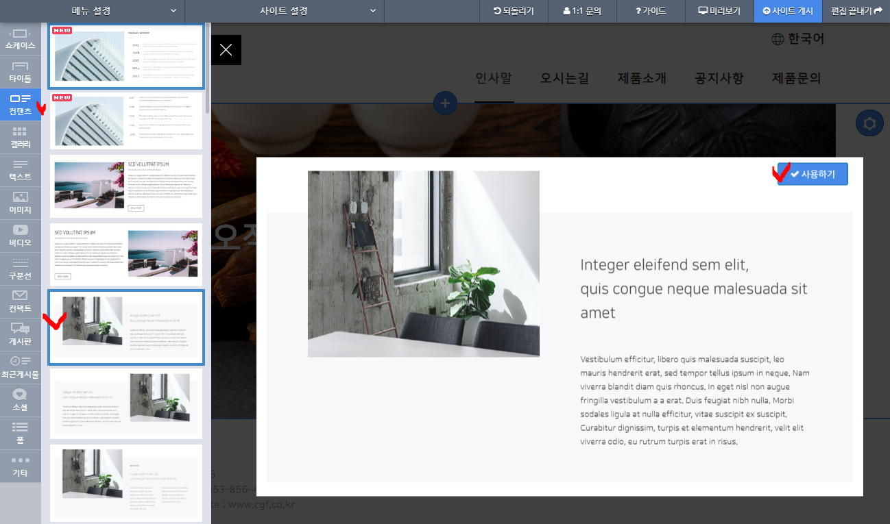 인사말에는 이미지와 텍스트를 함께 넣어 구성할 예정이므로 블럭 종류는 '콘텐츠' 중 다섯 번째 것을 사용하겠습니다.
