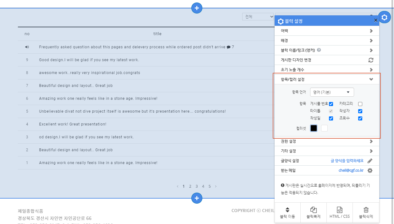 ![]() 인사말 타이틀 블럭을 복사 하였습니다. ![]() ![]() 복사한 블럭을 이동 후 [저장] 버튼을 누릅니다. ![]()