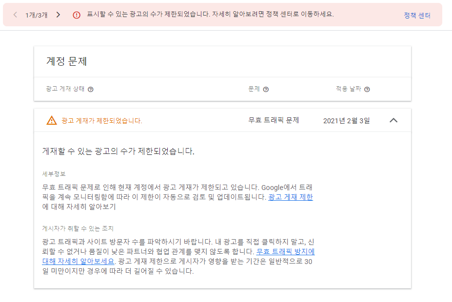 최근에 구글광고가 올라오지 않아서 구글애드센스관리자 페이지를 열어보니 아래와 같은 상황이라고 합니다.