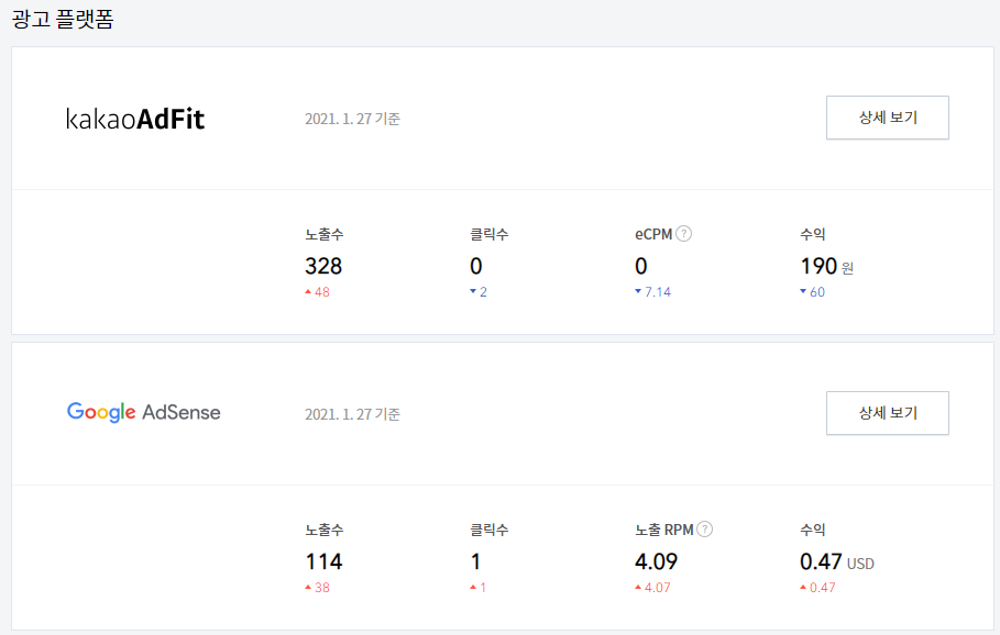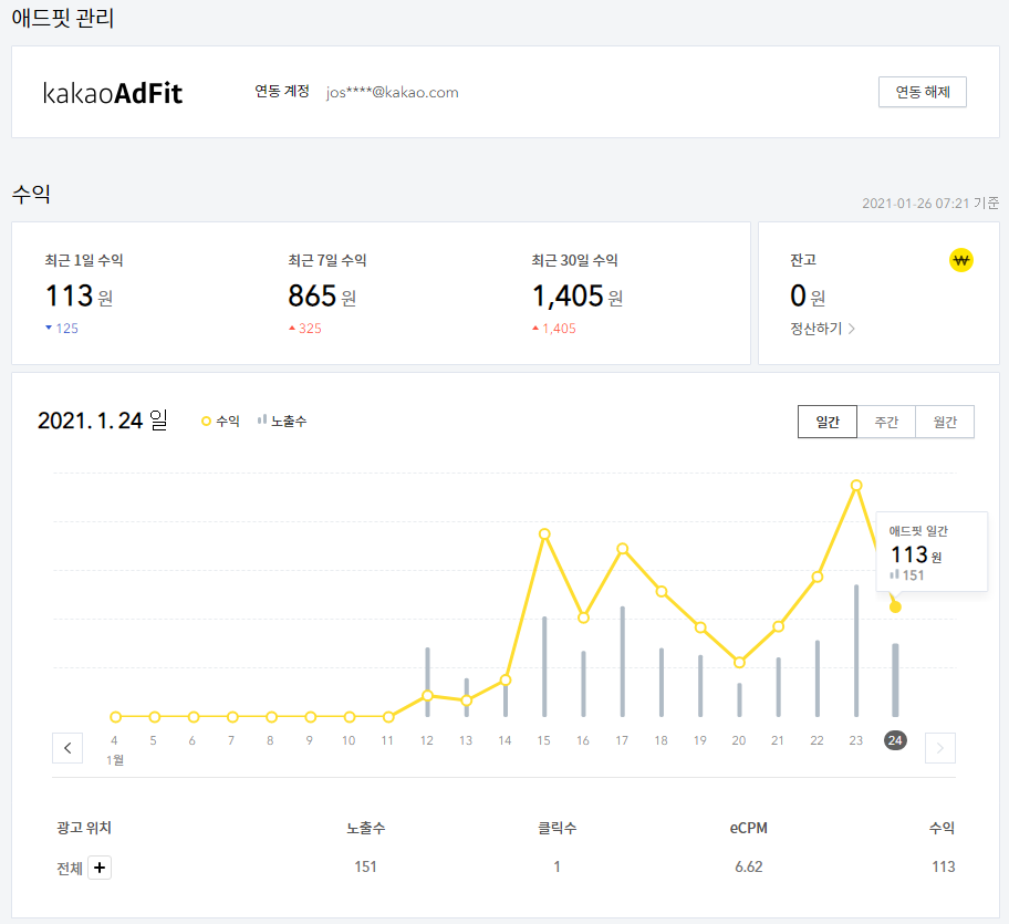 광고를 많이 안 띄우고 방문자수가 적어서 노출수나 클릭이 별로 없지만 그래도 수익금이 조금씩 쌓이고 있는걸 보면 재미는 있네요.