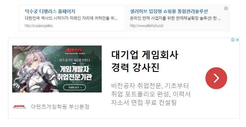 위에 작게 나오는 것이 kakao AdFit의 광고 영역이고 아래 크게 나오는 것이 google AdSense의 광고 영역입니다.