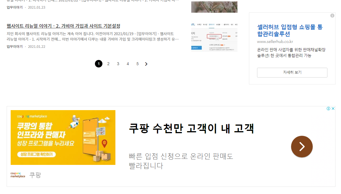 위 내용은 목록 하단에 보이는 광고인데요, 오른쪽 위에 보이는 작은 광고창은 kakao AdFit 광고가 사이드 영역에 뜨는 거고요, 아래 큼지막한 광고창이 바로 google AdSense 광고가 뜨는 영역입니다.