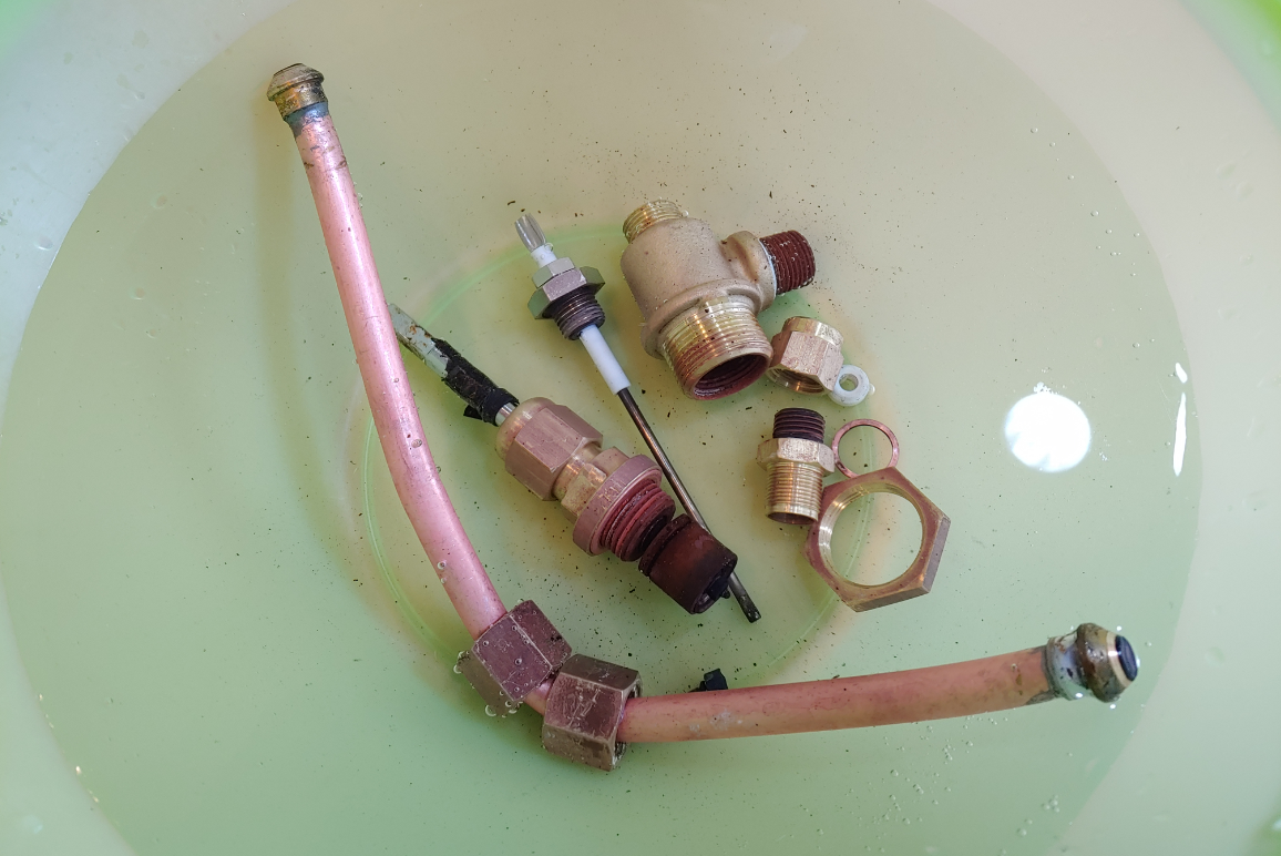 스케일 제거 용액에 담가서 때를 벗겨낸 스팀밸브용 동 배관입니다. 겉 때 보다 속의 시커먼 때를 잘 벗겨내어야 하는데 적절한 도구는 빨때 세척용 솔 또는 유사한 세척용 솔을 사용하면 편리합니다.