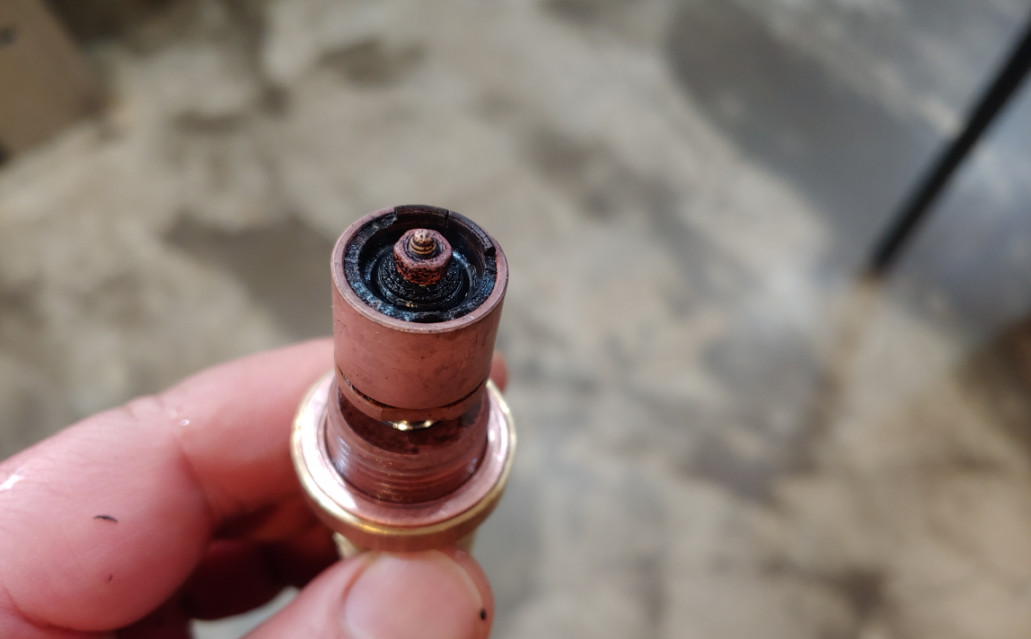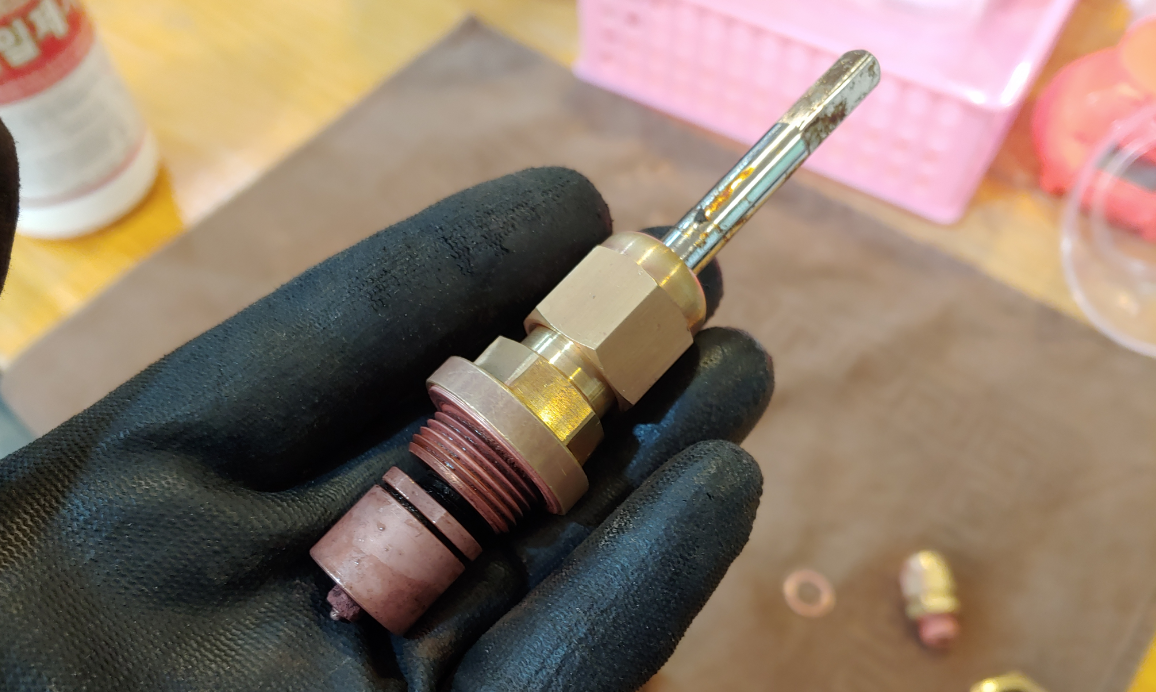 끝에 보이는 까만 부분은 개스킷(RUBBER GASKET)입니다. 고무 재질로 되어 있었으나 고열에 오래 노출되다 보니 경화되어 갈라지고 부서진 상태였으며 바로 이 부분 때문에 밸브를 꽉 잠가도 스팀이 세는 것입니다. 다행히 이 부분만 교체할 수 있으나 가급적이면 인서트 자체를 교체할 것을 추천드립니다. 굳어버린 개스킷 빼 내기가 쉽지 않거든요. 만약 쉽게 제거 가능하면 훨씬 저렴한 비용으로 해결 가능합니다.