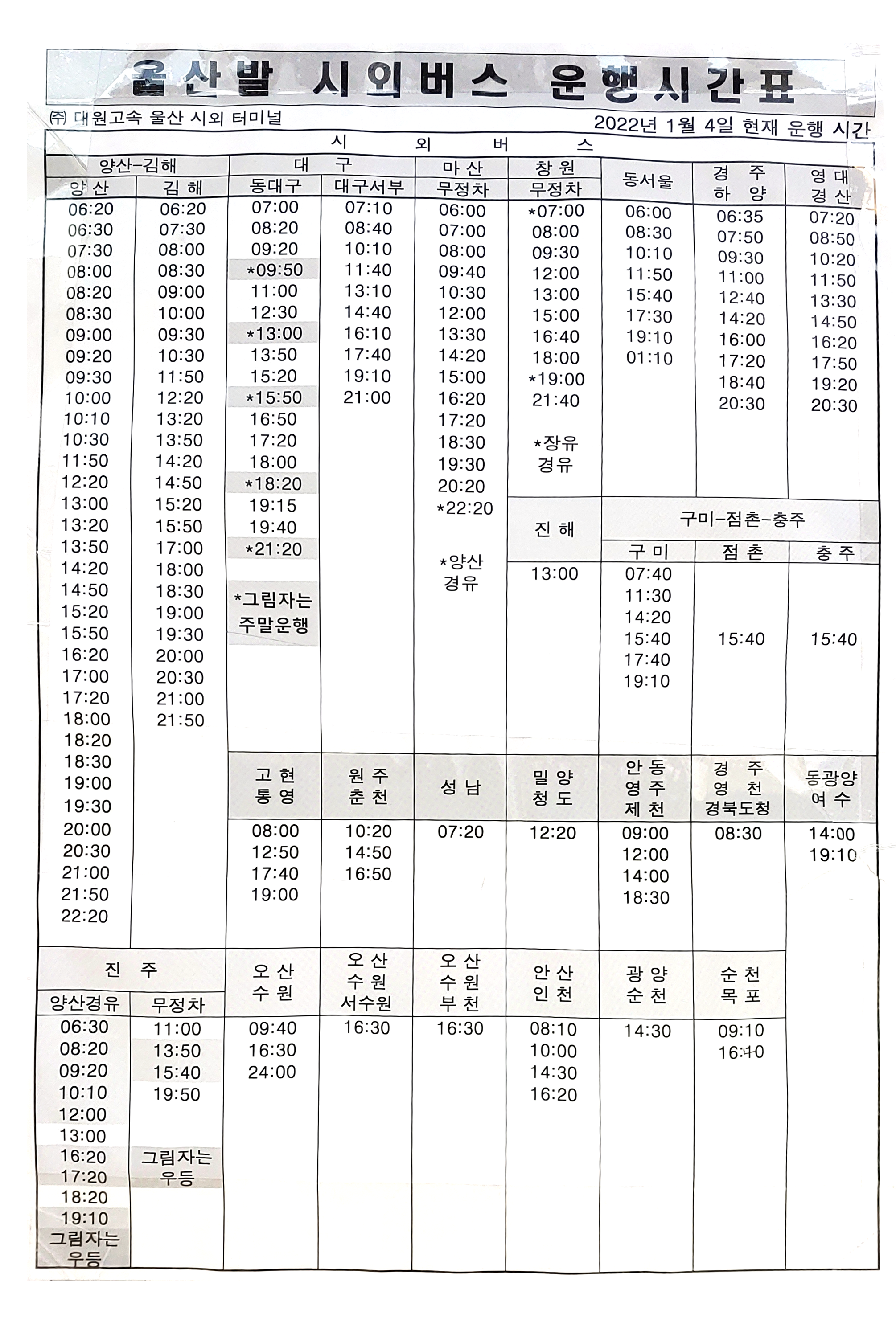 아래 시간표는 울산 시외버스터미널에서 출발하는 시간입니다.