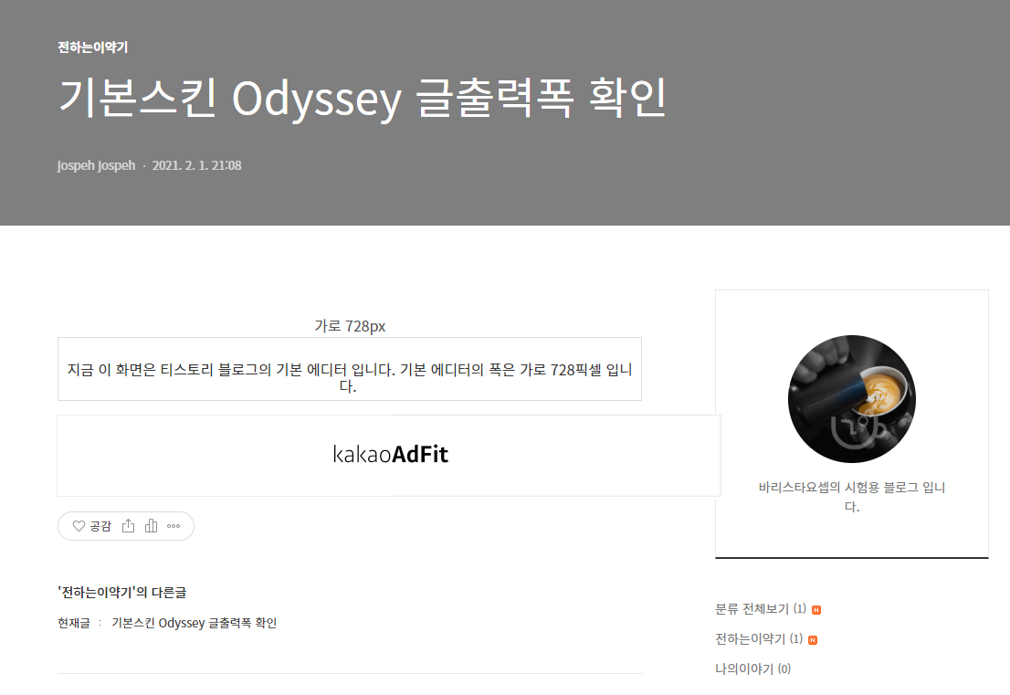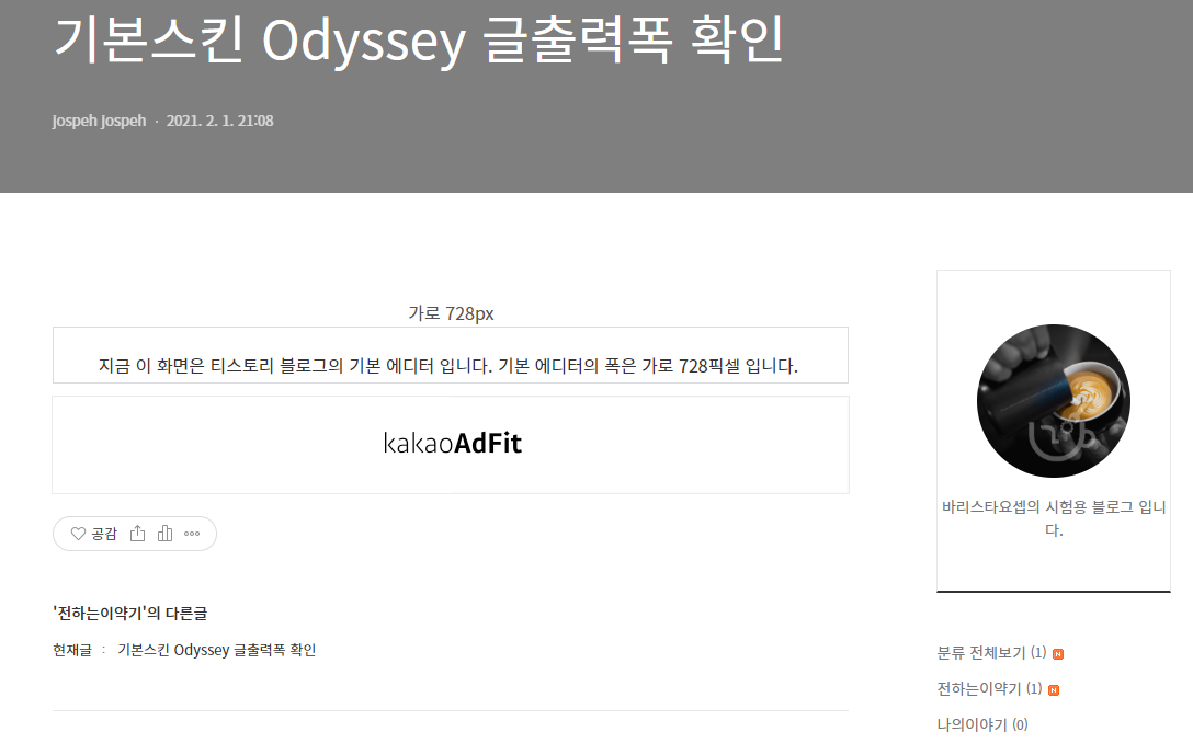 기본 스킨 중 Odyssey을 2단 우측 사이드바가 나오도록 해서 사용하면 우측 사이드바 때문에 글 읽을 때의 폭이 좁아서 답답하게 느껴집니다. 특히, kakaoAdFit 을 적용하게 되면 글 내용이 나오는 폭 보다 kakaoAdFit 폭이 더 넓어서 균형이 틀어지는 문제도 발생하게 됩니다.