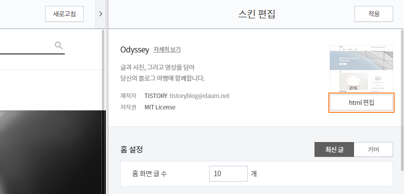 참고로, 제 블로그에 사용 중인 스킨은 Odyssey라는 기본 스킨에 위 내용을 수정하여 사용하고 있습니다. 혹시 저와 같은 스킨을 사용하려는 분에게 이 글이 도움이 되면 좋겠습니다.