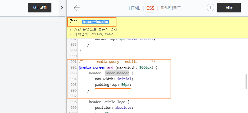CSS 수정창에서 Ctrl+F 키를 누른 후 'inner-header' 를 검색합니다.