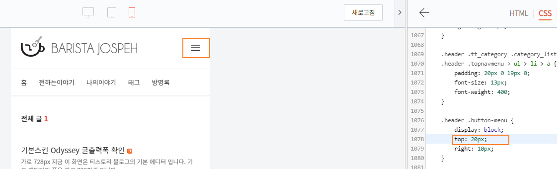 바로 이 부분이 메뉴버튼의 위치를 설정해 주는 듯합니다. 그중 top: 5px; 부분을 20px로 수정해 보도록 하겠습니다.