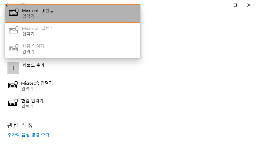 언어 옵션 - 키보드 추가 - Microsoft 옛한글 입력기 누름