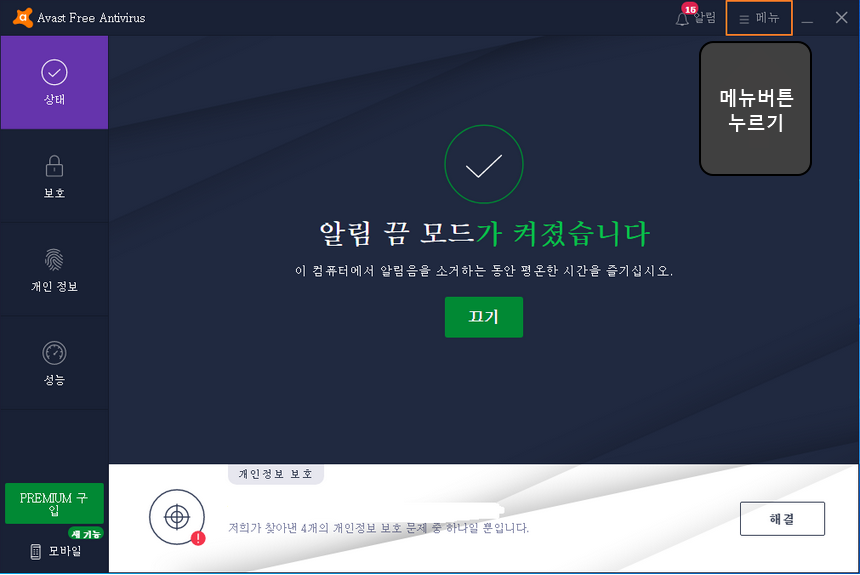 Avast 를 연 다음 '메뉴'를 누릅니다.