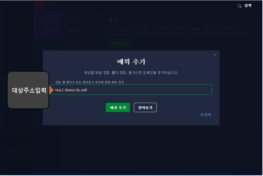 '예외 추가' 창이 뜨면 'img1.daumcdn.net'을 입력하고 [예외 추가] 버튼을 누릅니다.