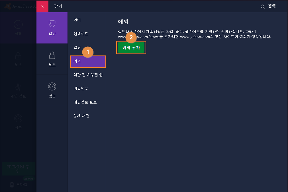 '예외'를 누른 후 '예외 추가'를 누릅니다.