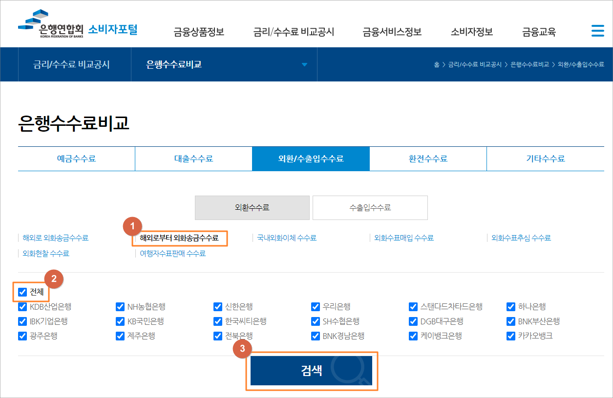 '해외로부터 외환송금수수료' 항목 선택 후 '전체' 은행을 선택하고 [검색] 을 누릅니다.